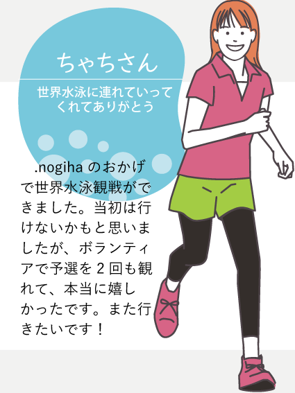 .nogihaのおかげで世界水泳観戦ができました。当初は行けないかもと思いましたが、ボランティアで予選を2回も観れて、本当に嬉しかったです。また行きたいです!